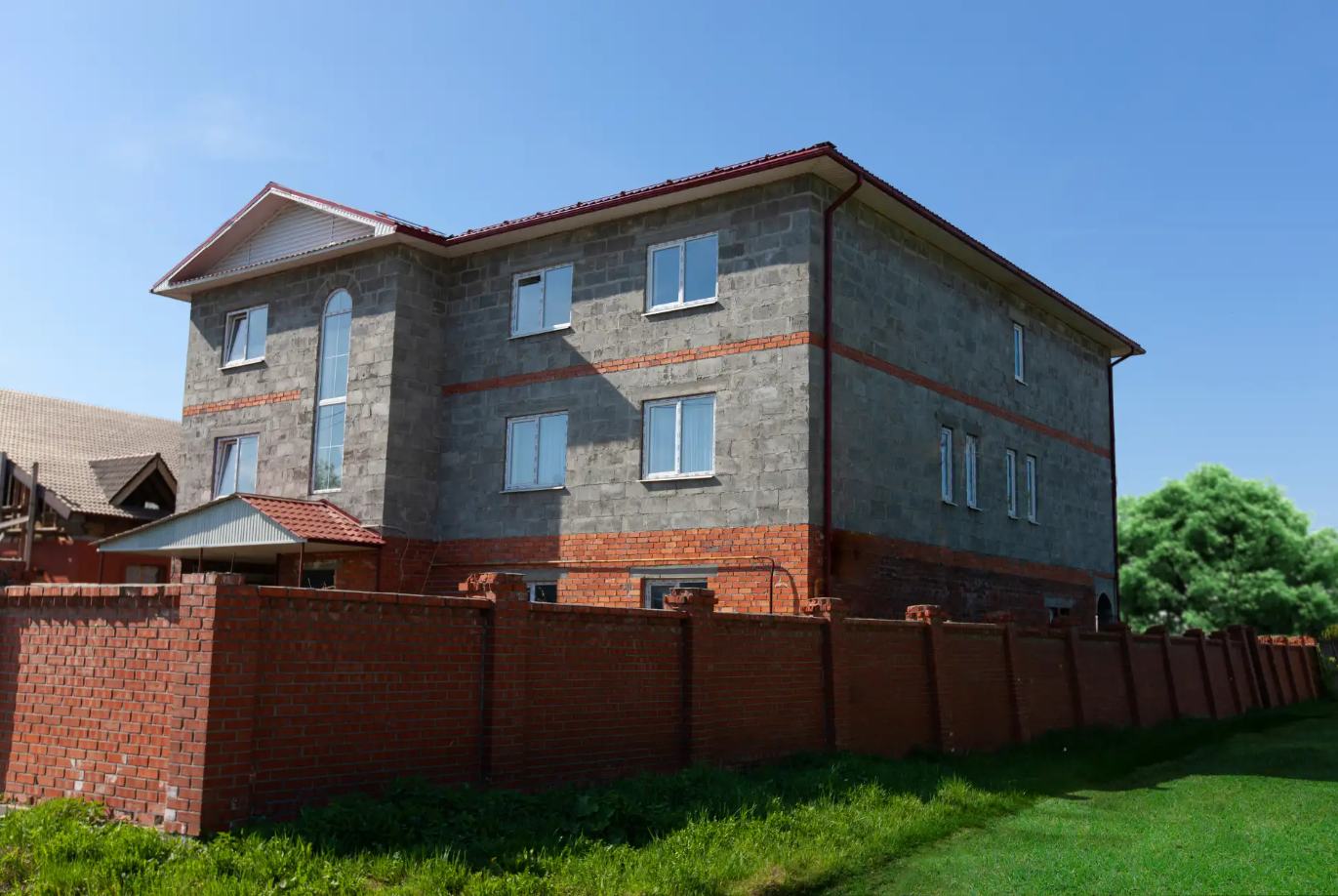 Стены дома выполнены из полистиролбетона: несущие - мегаблоки шириной 380 мм, перегородки - 100/188 мм. Межэтажные перекрытия выполнены из железобетонных плит толщиной 200 мм, а плиты покрытия - из полистиролбетона толщиной 380 мм.